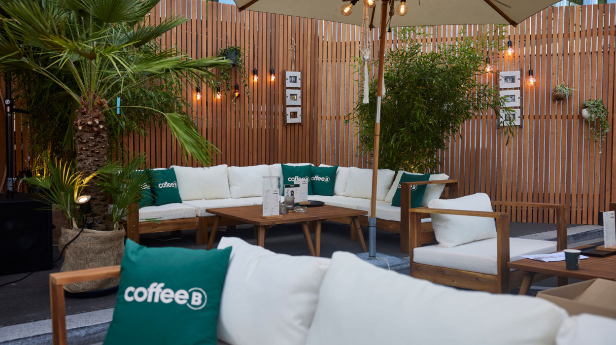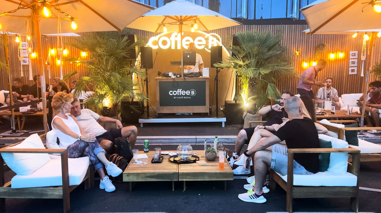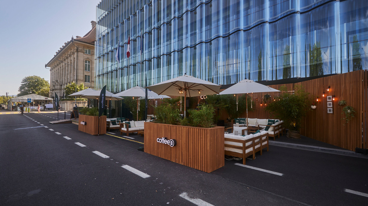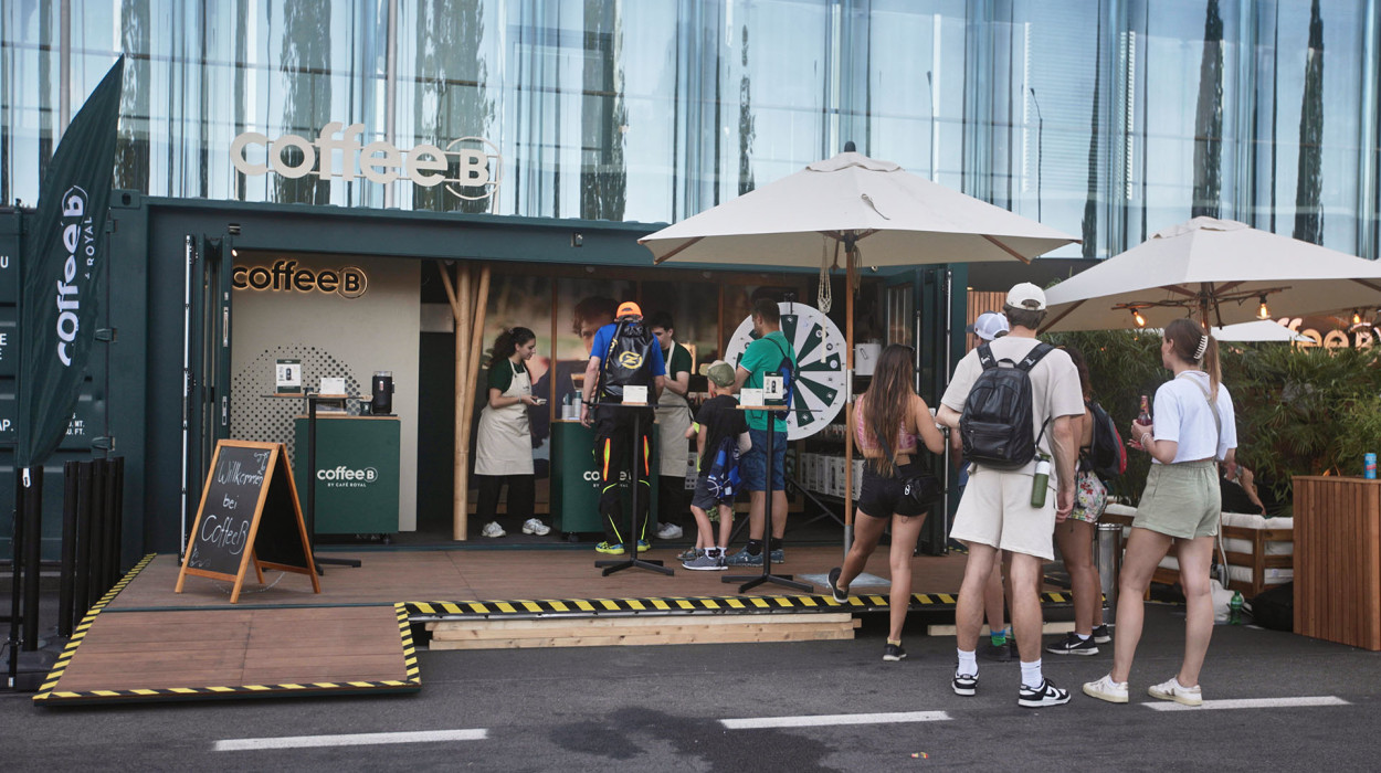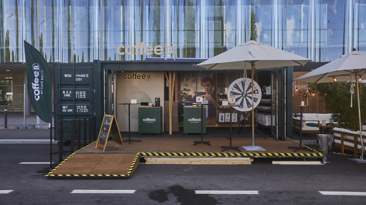 Container-Café als modularer, urbaner Treffpunkt mit starker Präsenz.
